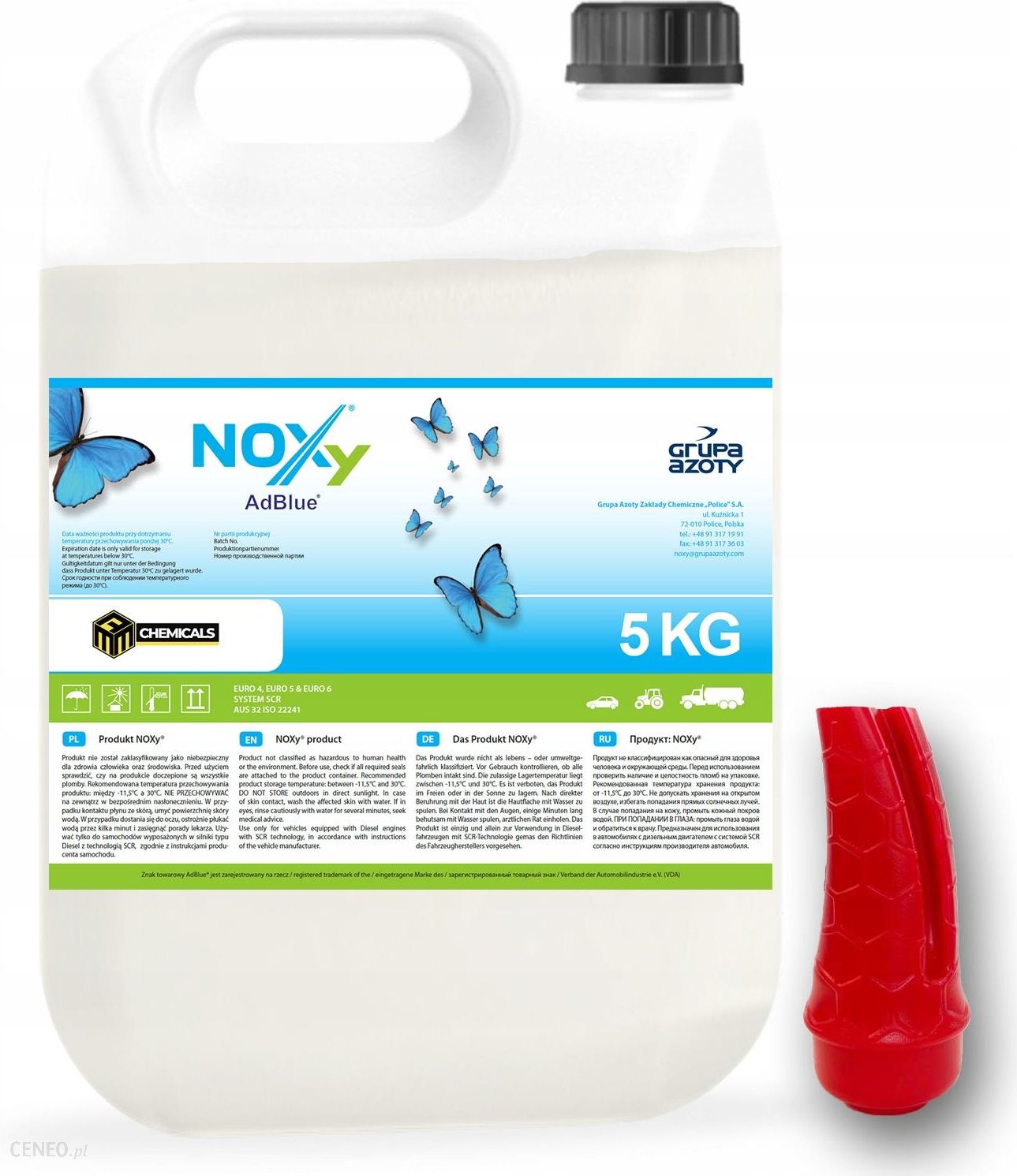 NOXY ADBLUE AD BLUE PŁYN KATALITYCZNY + LEJEK 5KGOpis produktu:NOXy® AdBlue® jest to roztwór wodny mocznika o jego wysokim stężeniu – 32,5%. Kiedy podda się go działaniu wysokiej temperatury, uwalnia się z niego amoniak, który pomaga zredukować szkodliwe związki w spalinach.Zastosowanie:AdBlue® przeznaczony jest do pojazdów zasilanych silnikami Diesla, które mają zainstalowany specjalny zbiornik na ten roztwór. Jest on przekazywany do katalizatora, przeznaczonego do oczyszczania spalin wydalanych z pojazdów. Dzięki jego działaniu spełniają normę Euro 6 – europejskiego standardu emisji spalin.NOXy® – produkt chemiczny znany również pod zarejestrowanym znakiem towarowym AdBlue®, stosowany jest przede wszystkim w najnowszych technologiach oczyszczania spalin. Jego zastosowanie pozwala na znaczną redukcję tlenków azotu (NOx), które są szkodliwe. Redukcja dokonywana jest aż do momentu uzyskania nietoksycznej pary wodnej oraz azotu.NOXy® doskonale odnajduje się w sektorze motoryzacyjnym – także w systemie Selektywnej Redukcji Katalitycznej (SCR). Pomaga więc dostosować się do obowiązującej normy emisji spalin (m.in. Euro V i Euro VI).Korzyści ze stosowania:Niższe zużycie paliwa o 3-4% przez silniki spełniające wymogi normy EURO IV oraz o 5% przez silniki zgodne z normą EURO V.Ochrona środowiska naturalnego poprzez spełnienie wymogów obowiązujących normy regulujących limity emisji szkodliwych substancji.Niższe opłaty drogowe w Polsce i całej UE.Możliwość utrzymania, a nawet wydłużenia okresów międzyserwisowych pojazdów.opakowanie 5KG